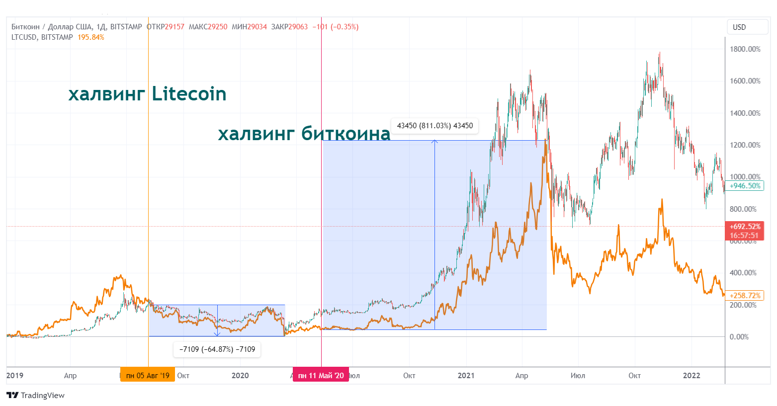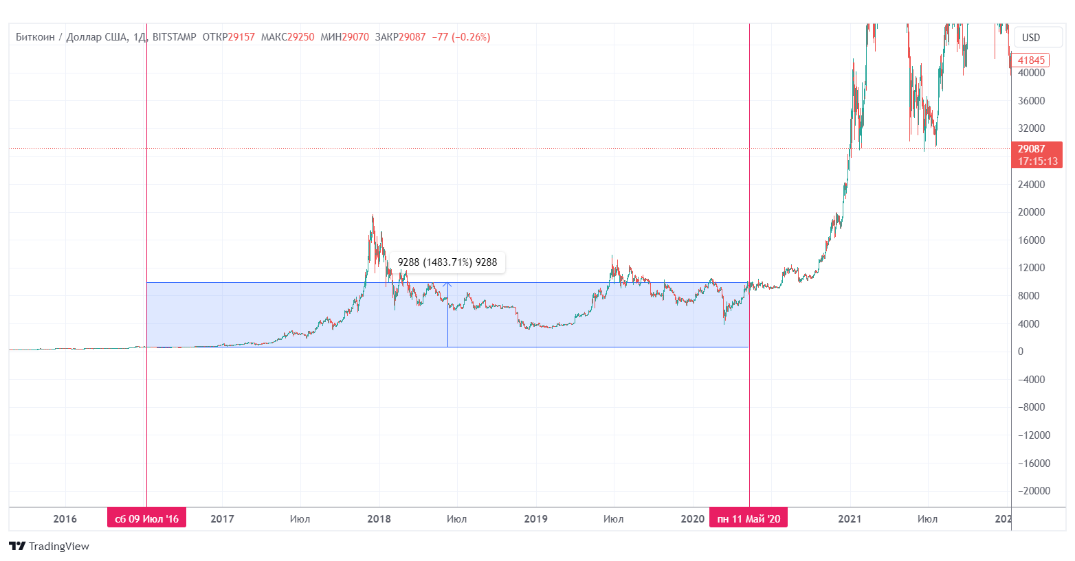 Для сравнения, между халвингом 2016 и 2020 годов лидер капитализации — биткоин, по данным TradingView, подорожал почти на 1500%.