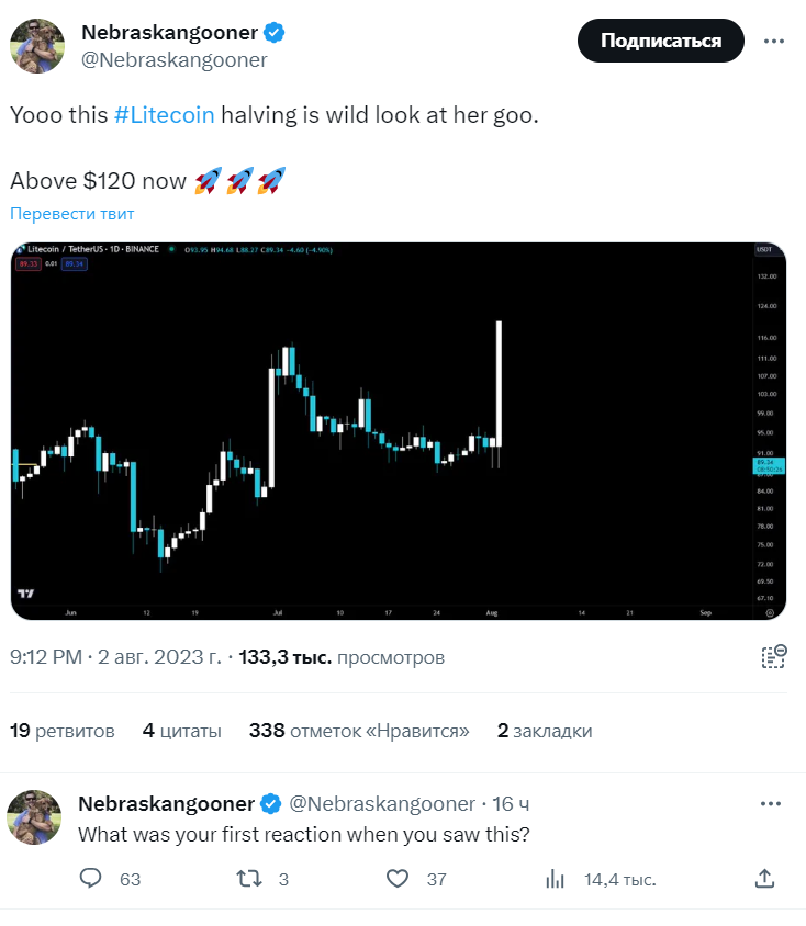Шуточный прогноз Litecoin популярного криптоблогера Nebraskangooner о движении монеты к уровню $120 показал, что в криптосообществе не так много оптимистично настроенных в отношении LTC людей. В комментариях к нему подписчики открыто высмеивают инвесторов, которые верят в рост Litecoin на фоне собственного халвинга 2023.