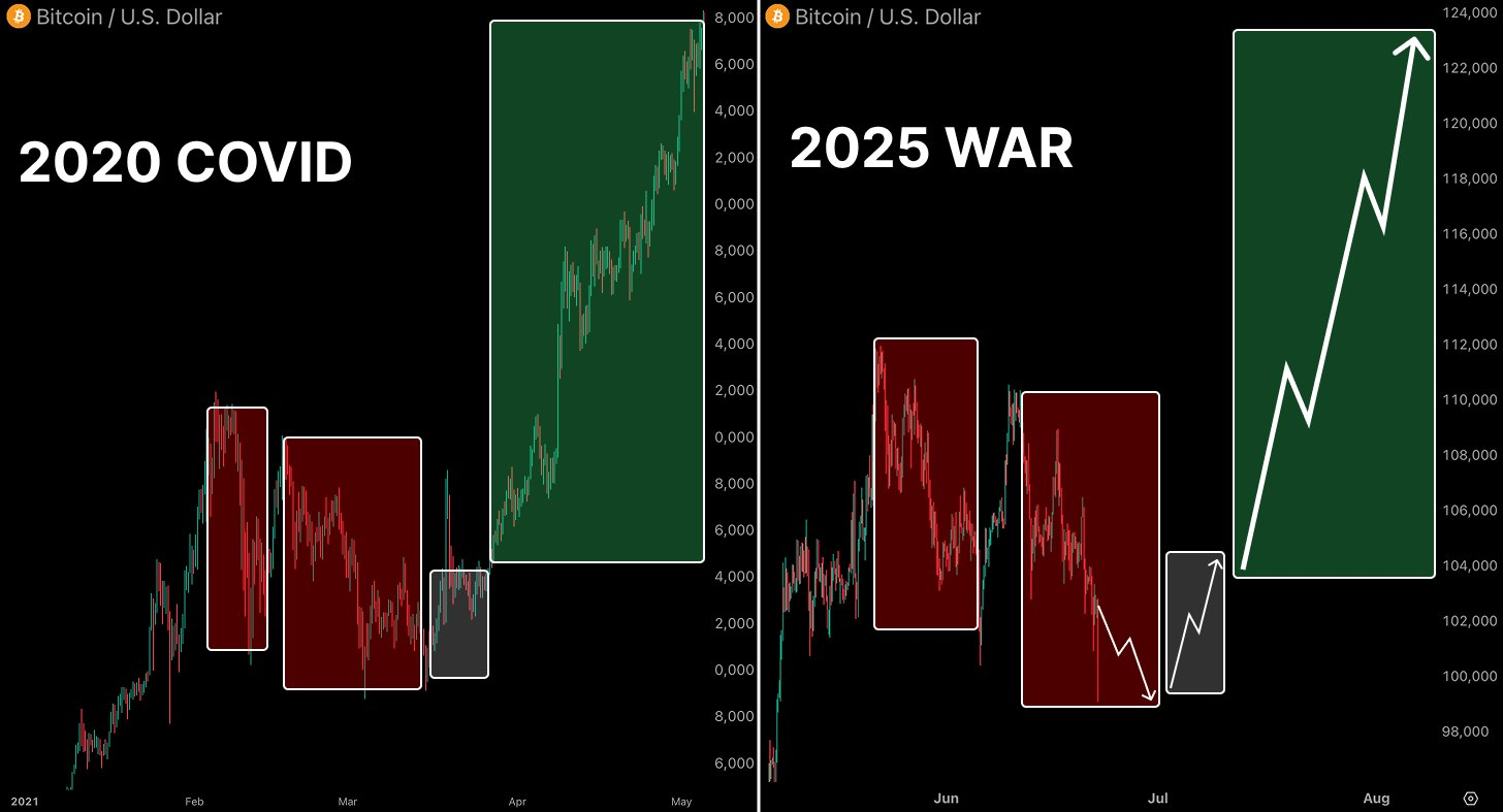 Есть прогнозы, авторы которых сравнивают поведение биткоина в июне 2025 с падением на фоне COVID-19. По их мнению, если криптовалюта будет следовать таймингу прошлых лет, возобновление буллрана и движение к новым максимумам будет возможно в августе 2025.