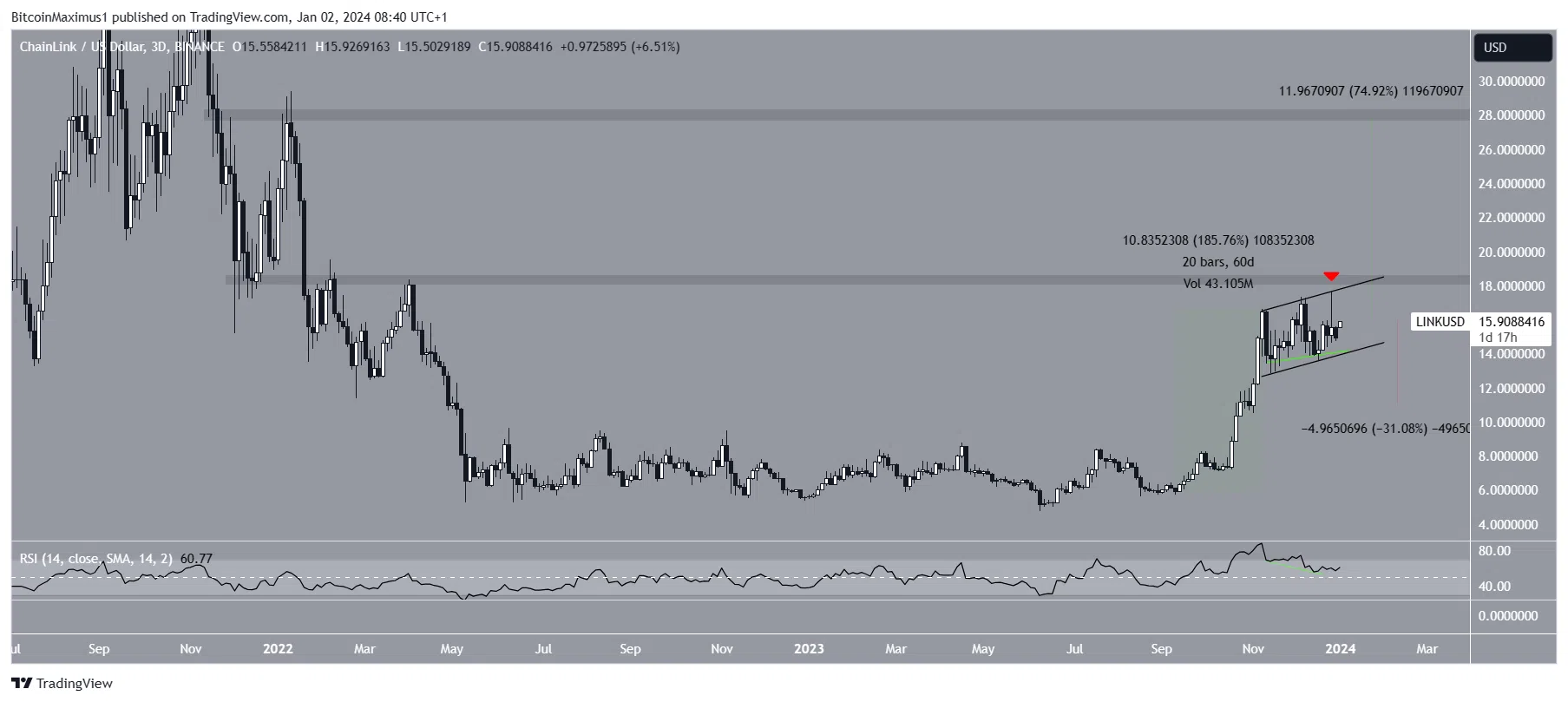 В сентябре и октябре 2023 года Chainlink стал одним из лидеров роста: за это время цена актива взлетела почти на 200%. Однако с тех пор ралли значительно замедлилось, и LINK консолидировался внутри восходящего параллельного канала. 28 декабря LINK обновил максимум 2023 года на уровне $17,67, однако затем цена сформировала длинный верхний фитиль и упала.