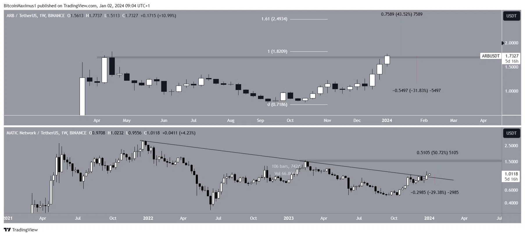 Однако бычий сценарий может потерпеть неудачу при закрытии ниже области сопротивления $1,70 и нисходящей линии сопротивления соответственно. Это может привести к падению ARB и MATIC на 30%.
