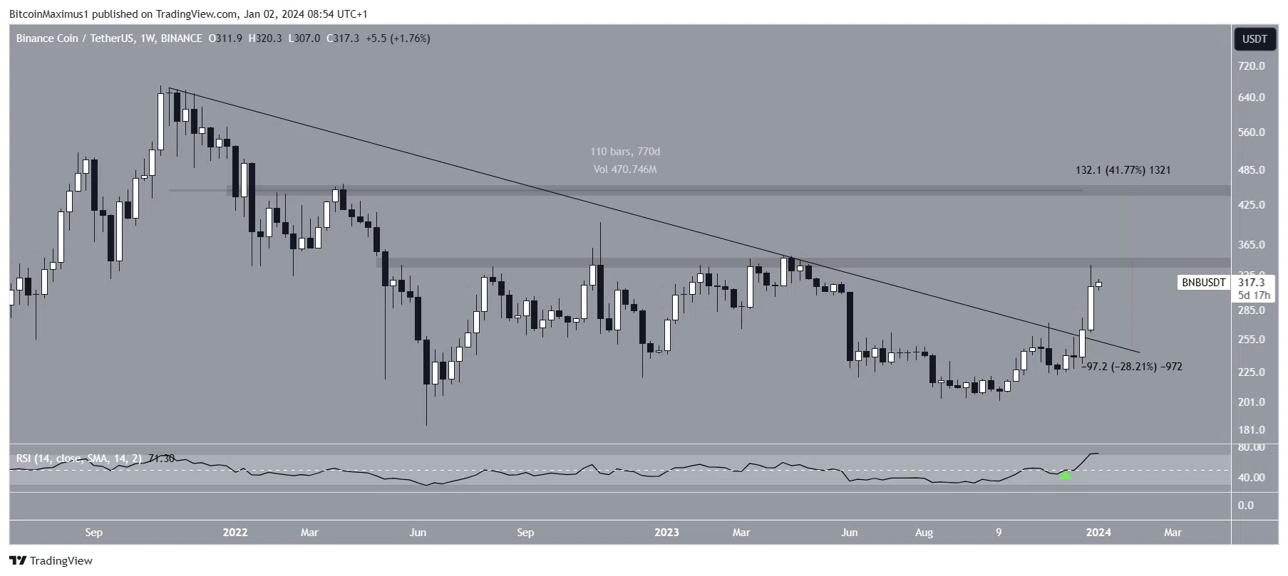 Цена BNB начала расти после достижения минимума в $202 в октябре 2023 года. Во время движения вверх актив прорвался выше долгосрочной нисходящей линии сопротивления, которая продержалась более 770 дней. На прошлой неделе альткоин обновил годовой максимум в $320. Недельный RSI узаконил прорыв, поднявшись выше 50.