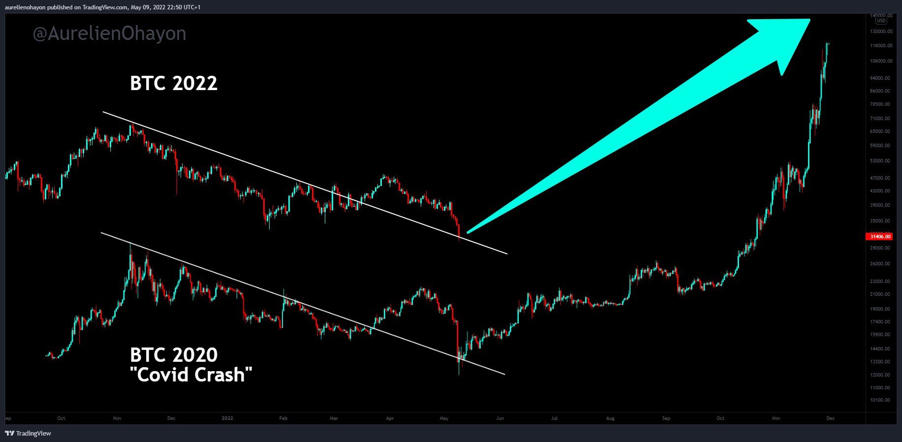 Не все участники крипторынка считают, что впереди биткоин ждет затяжное падение. Например, аналитик Орельен Охайон уверен в том, что BTC находится на пороге выхода в новую фазу роста. Свою точку зрения он проиллюстрировал через сравнение поведения биткоина в 2020 году на фоне пандемии коронавируса с движением монеты в 2022 году.