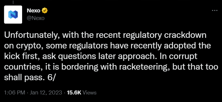 Публично в Nexo никак не прокомментировали расследование властей Болгарии, однако компания написала у себя на странице в твиттере, что из-за недавних ужесточений регулирования крипторынка, некоторые регуляторы «решили сначала нанести удар, а потом задавать вопросы».