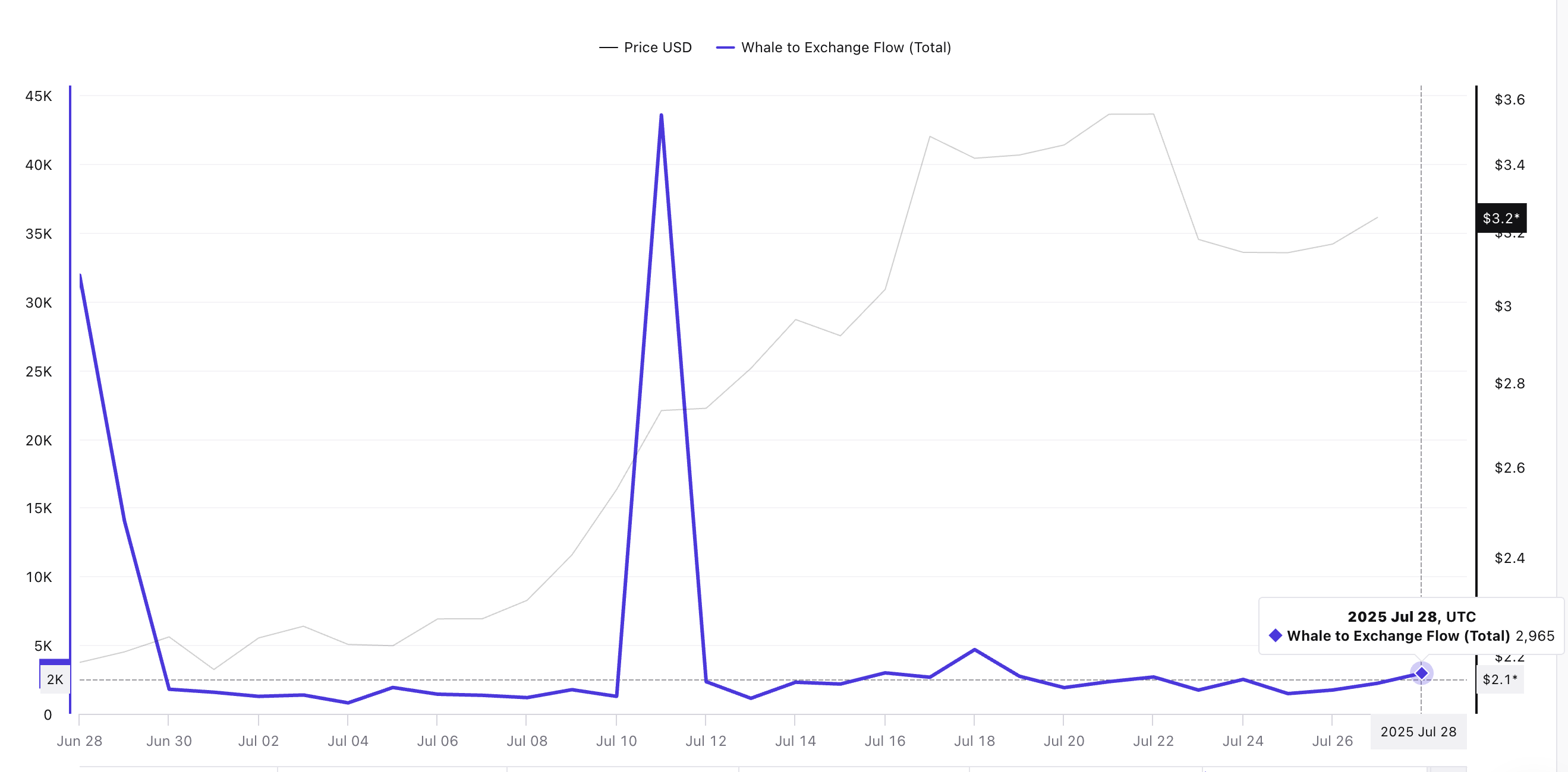 Одним из сильных сигналов в пользу XRP стало резкое снижение потоков от китов на биржи — ключевого показателя, отслеживающего перемещения крупных держателей, обычно предшествующего продажам. 11 июля он достиг 43 575 XRP. К 28 июля поток снизился на 93,2% до 2 965 XRP.