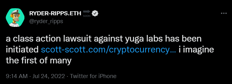 Студия Yuga Labs, разработавшая коллекцию невзаимозаменяемых токенов (NFT) Bored Ape Yacht Club (BAYC), столкнулась с коллективным иском. Об этом у себя в твиттере сообщил NFT-инвестор @ryder_ripps.