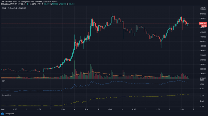 Таким образом, прирост составил почти 45%, а проект вышел на второе место по TVL согласно данным DeFi Pulse. Токен обновил ценовой максимум на торгах 5 февраля, преодолев отметку в $500. Текущий исторический рекорд курса AAVE — $536,96.