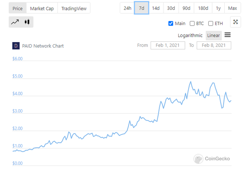 Наконец, титул лидера роста на этой неделе уходит монете PAID. С момента запуска 26 января нативный токен сети вырос на 455,9%. Сейчас им можно торговать только на децентрализованных биржах типа Uniswap. Начав свой путь с $0,84, к 7 февраля монета подорожала на $4,82.