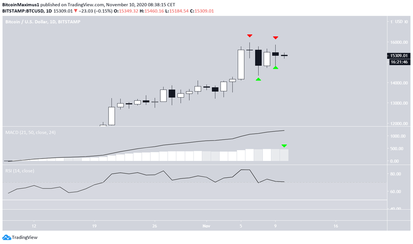 Курс биткоина (BTC) демонстрировал 9 ноября нерешительность. Несмотря на существенный прирост днем ранее, цена сформировала вчера небольшую медвежью свечу с двумя фитилями, что указывает на неспособность рынка выбрать дальнейшее направление.