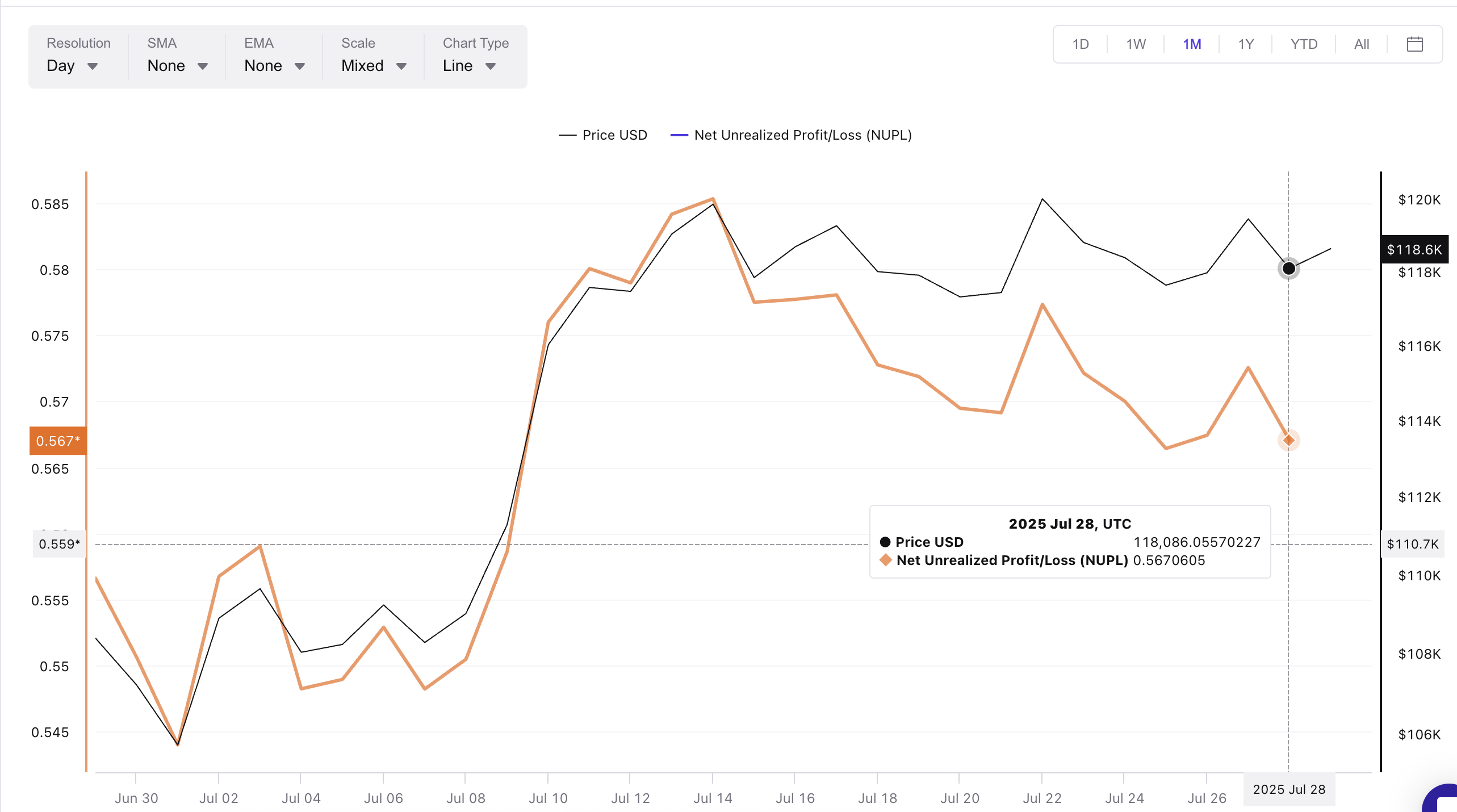 Net Unrealized Profit/Loss (NUPL) измеряет нереализованную прибыль в системе, давая представление о том, когда держатели могут захотеть продать. За последние две недели показатель достигал пика между 0,57 и 0,58 каждый раз, когда биткоин тестировал зону $119 000–$120 000: это происходило 14, 17, 22 и 27 июля.