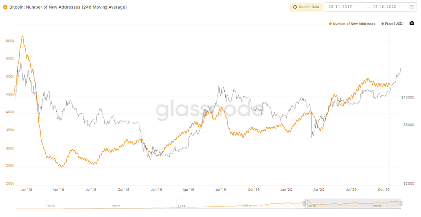 Аналитический сервис GlassNode сообщил 18 ноября в Twitter, что усредненный 24-дневный показатель новых адресов, созданных в сети биткоина, взлетел к максимальному с января 2018 года значению.