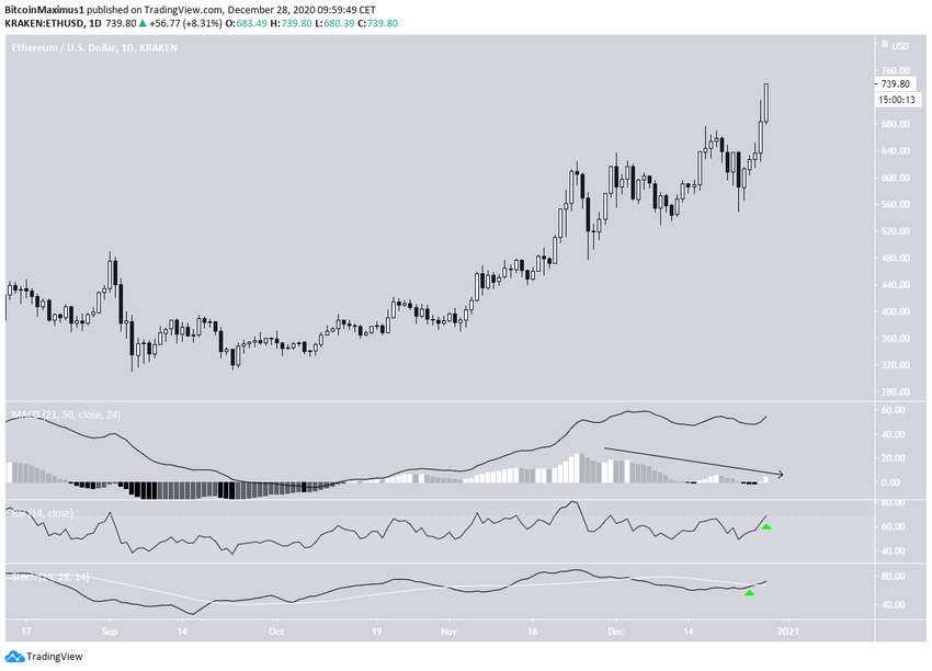 Хотя индикатор MACD теряет силу, индекс RSI и осциллятор стохастика растут. Это указывает на вероятность того, что ETH может продолжить продвижение на север в направлении выставленных нами целей.