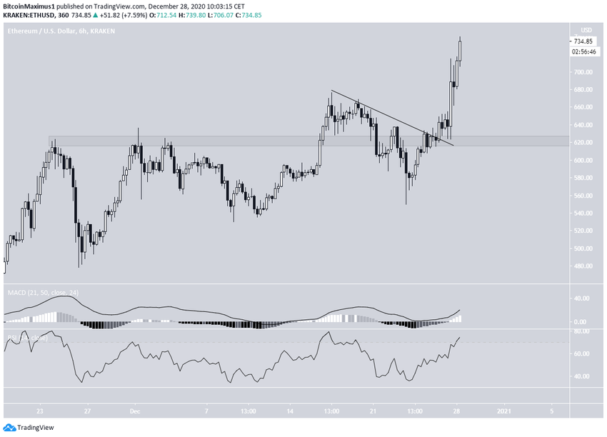 Аналогичным образом, на 6-часовом графике курс ETH совершил бычий пробой линии нисходящего сопротивления и с тех пор укрепляется, превратив этот уровень в поддержку.