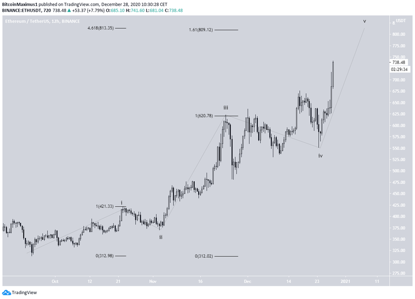 Результаты волнового анализа предполагают, что ETH завершил формирование 4-й волны и начал 5-ю волну (черный цвет на графике внизу).