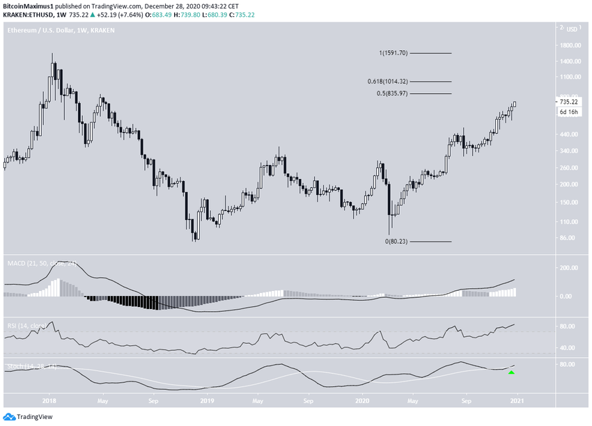 Курс Ethereum (ETH) нацелился на область долгосрочного сопротивления $835-$1015. Здесь проходит важный уровень коррекции Фибоначчи от исторического максимума.