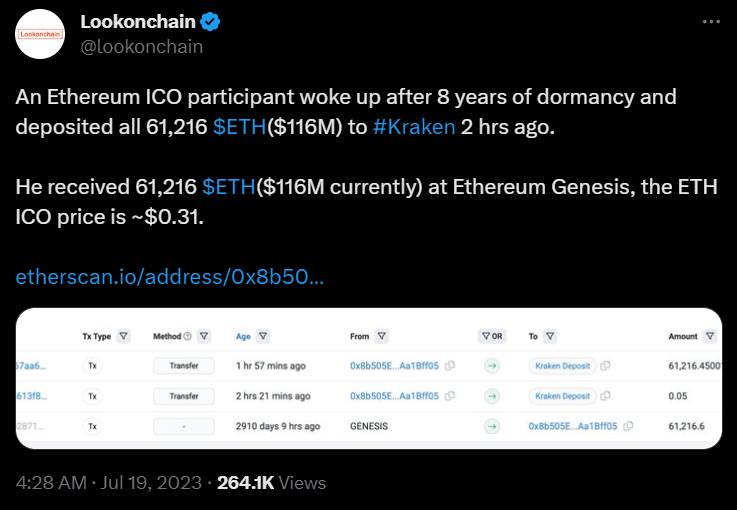 Как выяснили исследователи, инвестор через ICO получил 61 216 ETH при тогдашнем курсе в ~$0,31. На каких условиях он получил криптовалюту, неясно. Тогда сумма оценивалась в менее чем $19 000, однако по курсу на момент вывода ETH на биржу заявленный объем оценивается в $116,3 млн. Всю сумму неизвестный вывел на адрес криптовалютной биржи Kraken. Неясно, продал ли инвестор сбережения или решил воспользоваться биржевыми услугами стейкинга.