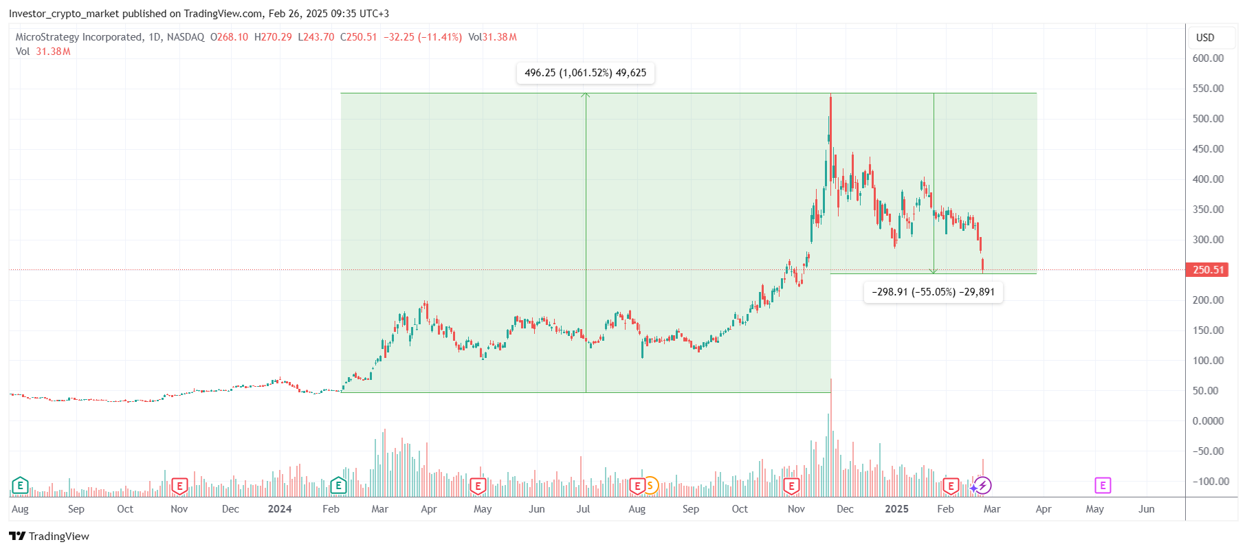 Strategy (ранее MicroStrategy) является крупнейшим инвестором биткоина среди публичных компаний. Недавно она столкнулась с падением своих акций на более чем 55%. Пике ценных бумаг заставило участников криптосообщества перешептываться о том, не будет ли Strategy вынуждена продать свои биткоины, чтобы побороть кризис