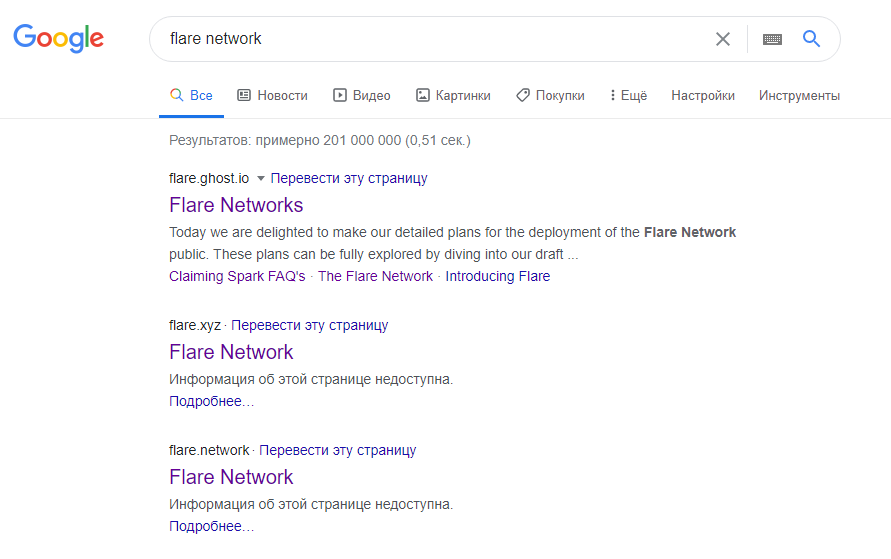 Стоит отметить, что при запросе «flare network» в Google в выдаче выпадает сразу три сайта на близкую тематику, но с разными доменами: flare.ghost.io, flare.xyz и flare.network. Последний домен автоматом переадресовывает на официальный сайт (flare.xyz).