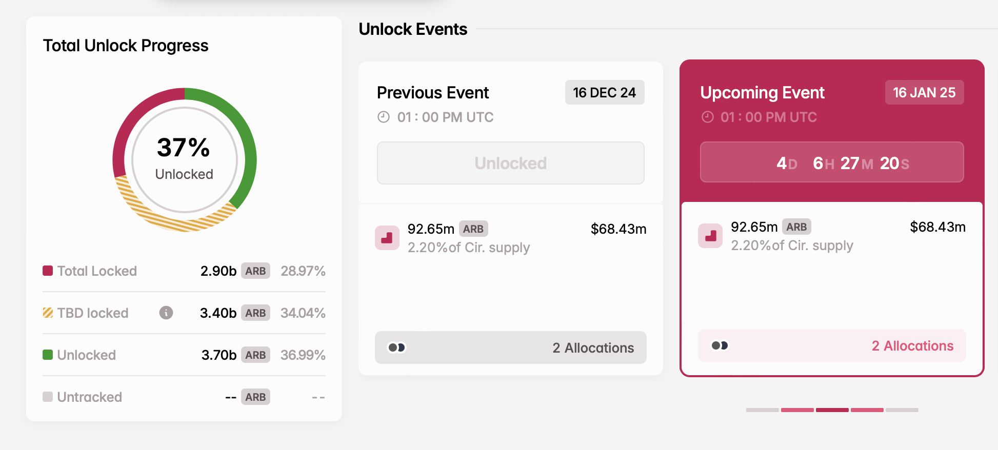 - Количество разблокированных токенов: 92,65 млн ARB