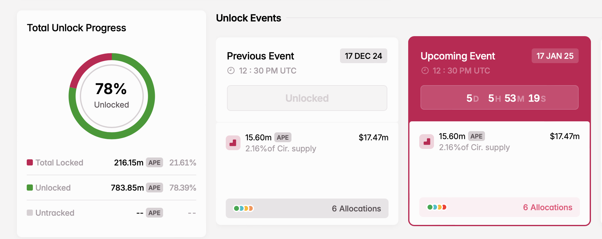 - Количество разблокированных токенов: 15,60 млн APE
