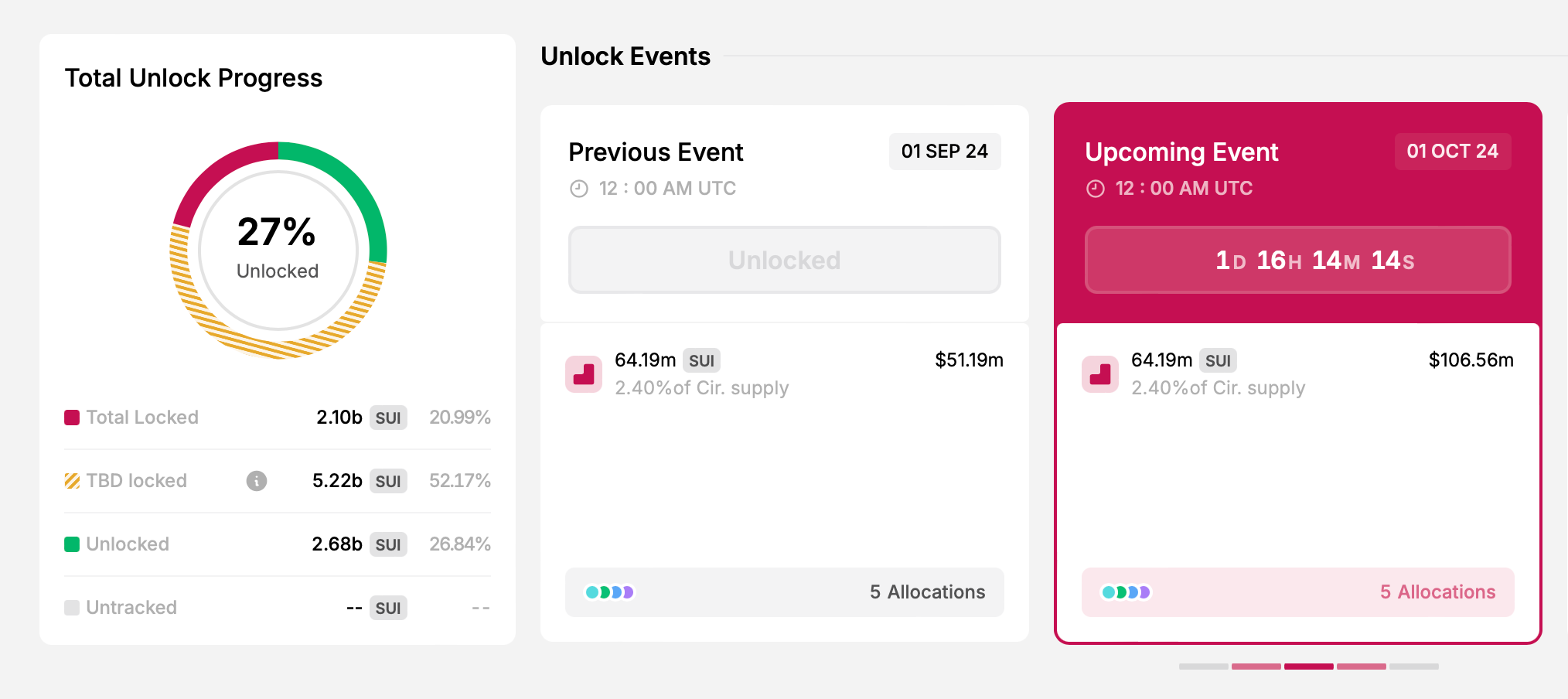 В первый день октября проект Sui разблокирует 64,19 млн токенов. Монеты стоимостью более $105 млн составляют 2,40% от текущего объема циркулирующего предложения SUI. Распределение будет следующим: