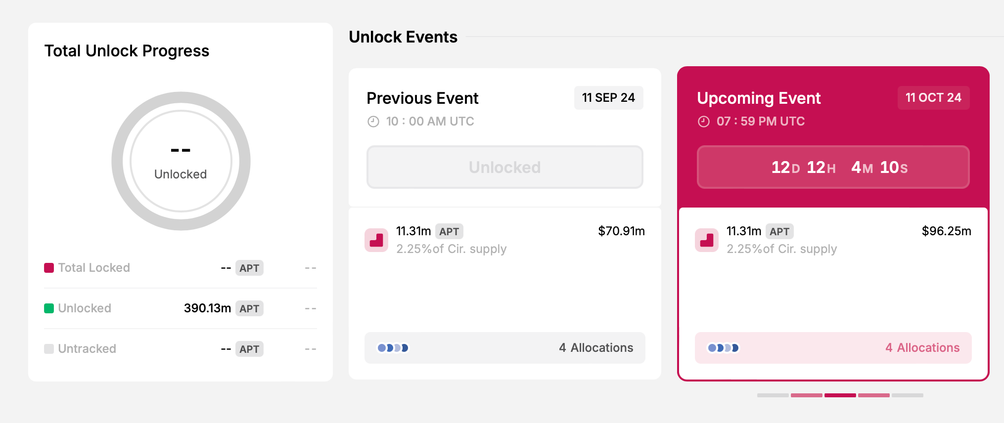 11 октября Aptos выпустит на рынок 11,31 млн токенов APT, что составляет 2,25% от общего предложения актива. Совокупная стоимость этих монет — $96,25. Высвобожденные токены разделят между фондом Aptos, сообществом, инвесторами и командой проекта.