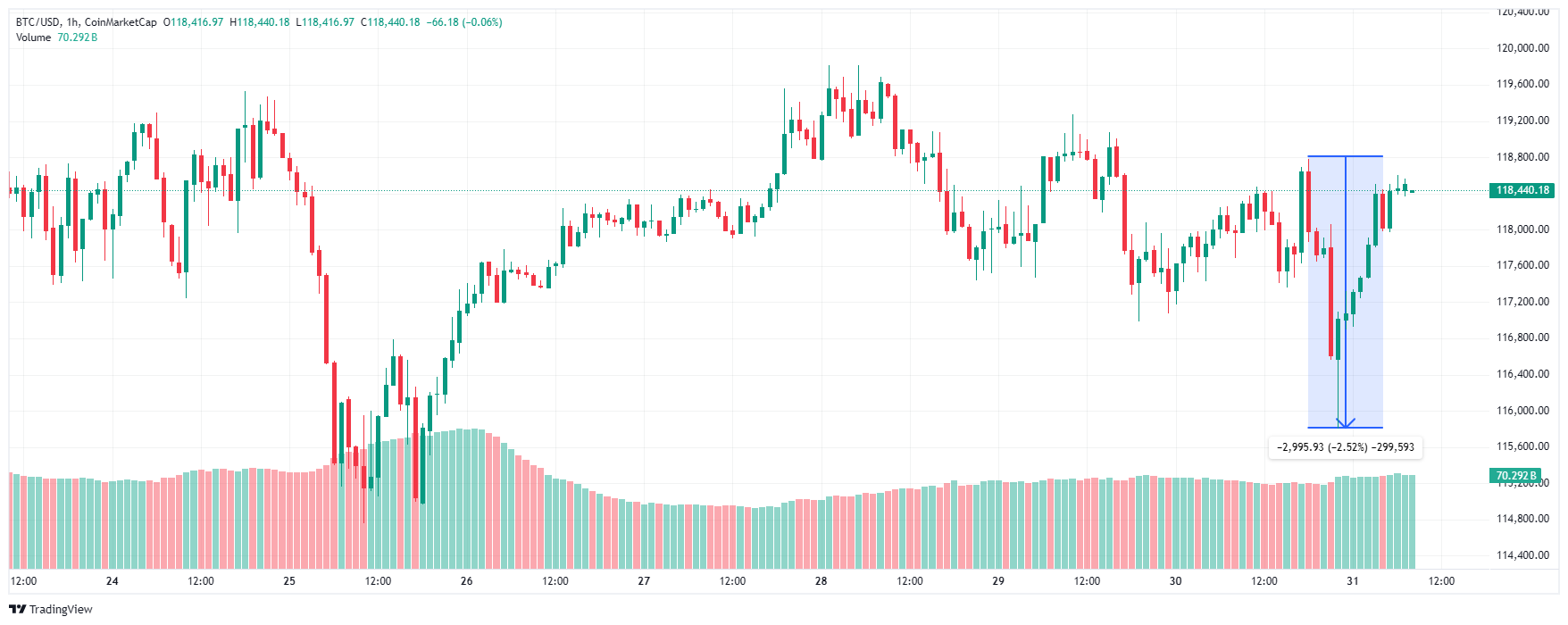 На фоне выхода новостей о решении регулятора биткоин в моменте падал ниже $116 000, но после скорректировался. Сейчас криптовалюта торгуется по $118 440.