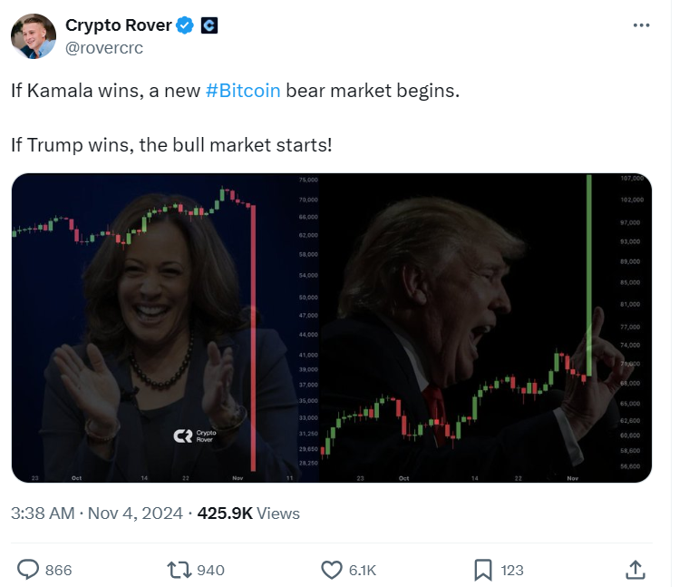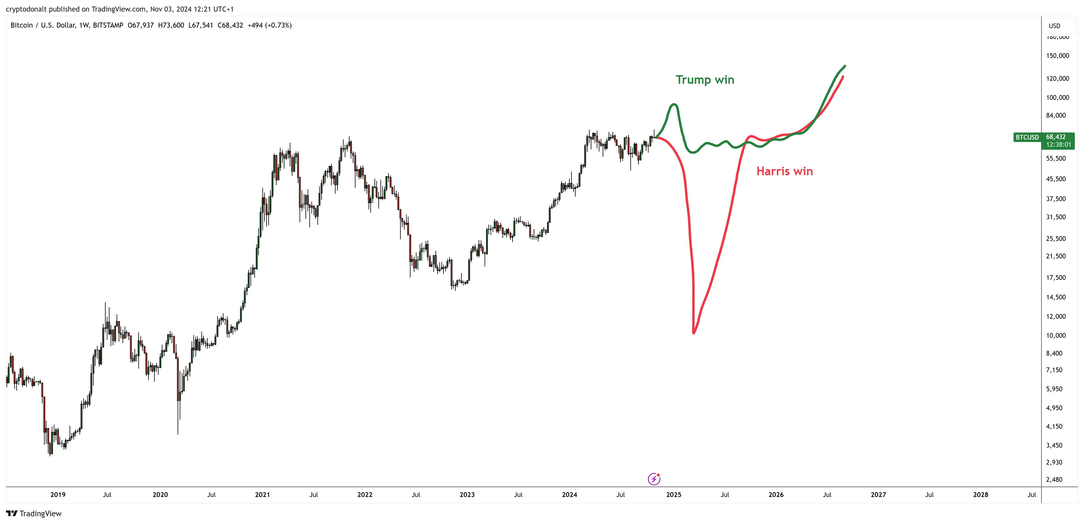 Популярный криптоблогер DonAlt в свою очередь считает, что исход выборов не отразится на долгосрочных перспективах BTC. Он поддерживает предположения о том, что победа Харрис в моменте может спровоцировать распродажу биткоинов. При этом DonAlt считает, что в итоге рынок оправится от паники и продолжит рост.