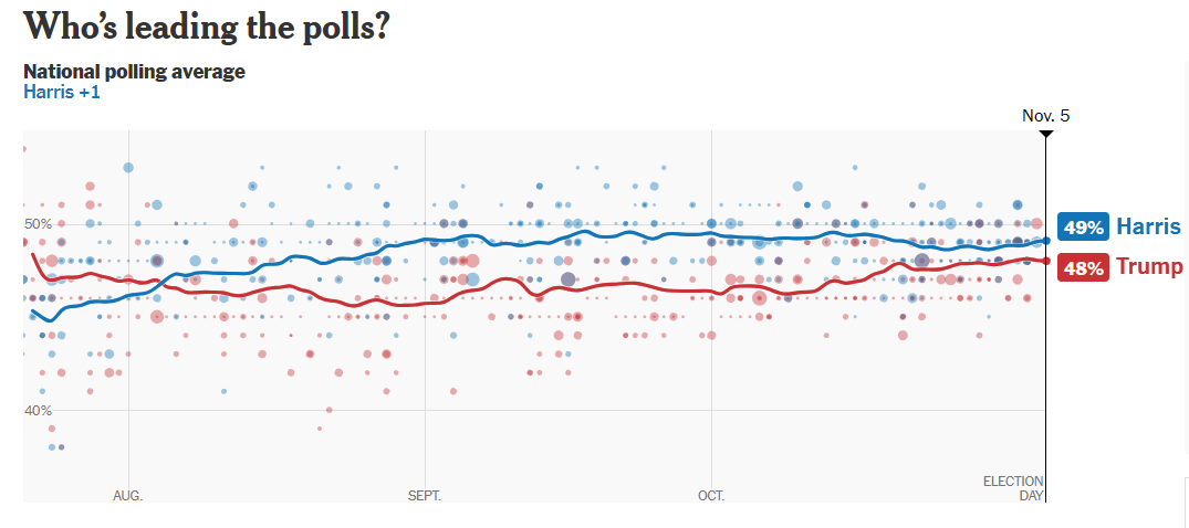 The New York Times пишет, что в лидеры, напротив, вышла Харрис. Их данные опросов показывают, что у вице-президента перевес в 1%.
