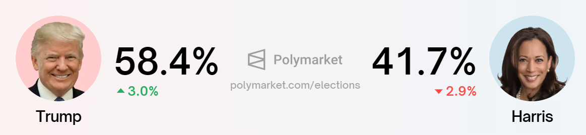 На рынке прогнозов Polymarket уверено лидирует Трамп. В его победу верят свыше 58% участников. Ранее редакция BeInCrypto писала о том, что, по мнению экспертов, платформа искусственно завышает шансы Трампа на победу.