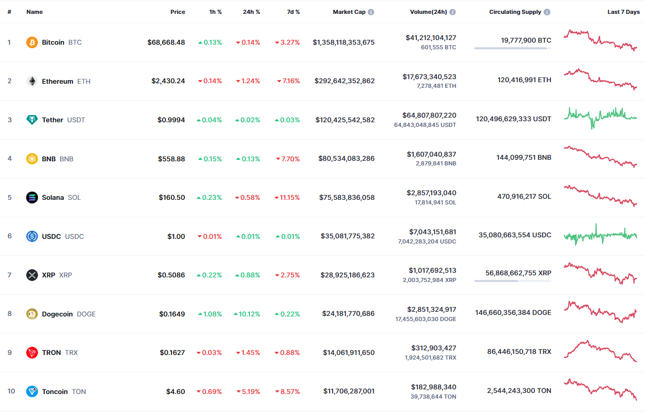 Напомним, 29 октября BTC предпринял попытку штурма абсолютного максимума, который зафиксирован 14 марта 2024 года на уровне $73 750. После криптовалюта вышла в коррекцию. По состоянию на момент написания обзора, биткоин торгуется по $68 668.