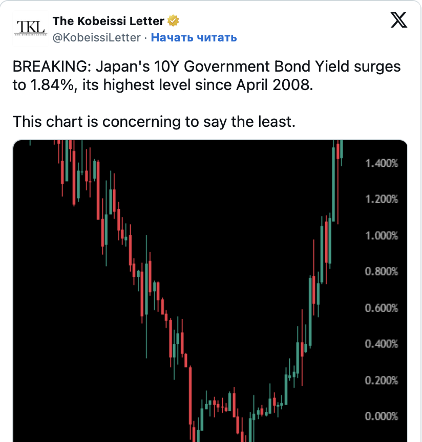 Популярный обозреватель Shanaka Anslem назвал график доходности JGB пугающим для любого управляющего портфелем. Стратег, наблюдавший множество валютных шоков и кризисов государственного уровня, указал на ключевые факторы риска: