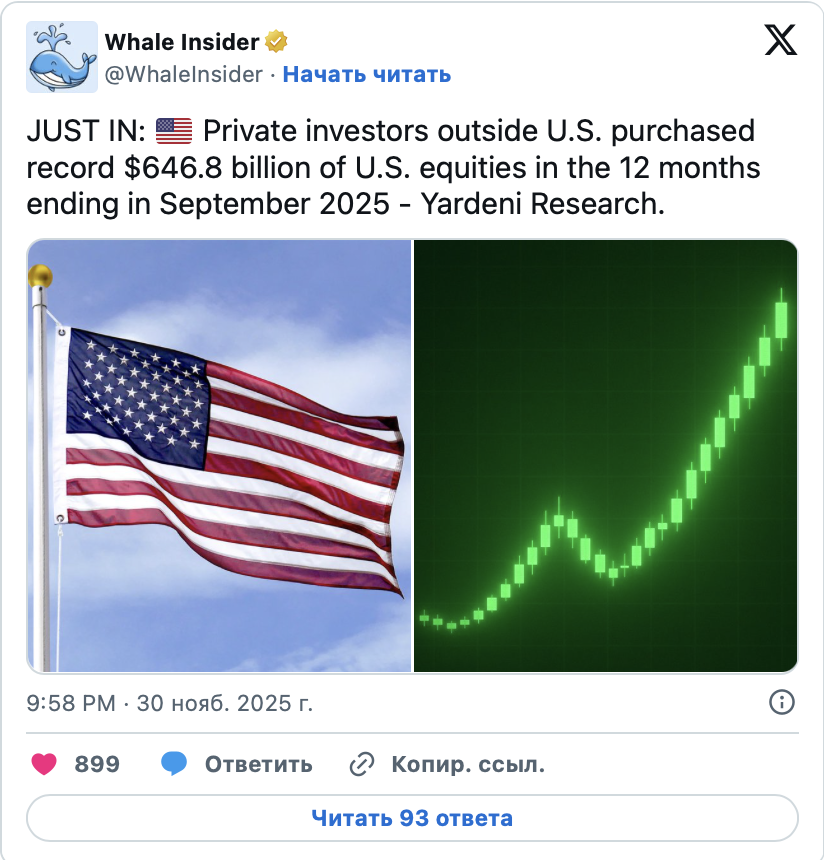 Частные инвесторы из-за пределов США приобрели американские акции на сумму $646.8 млрд за 12 месяцев, закончившихся в сентябре 2025 года. Об этом свидетельствуют данные Yardeni Research.