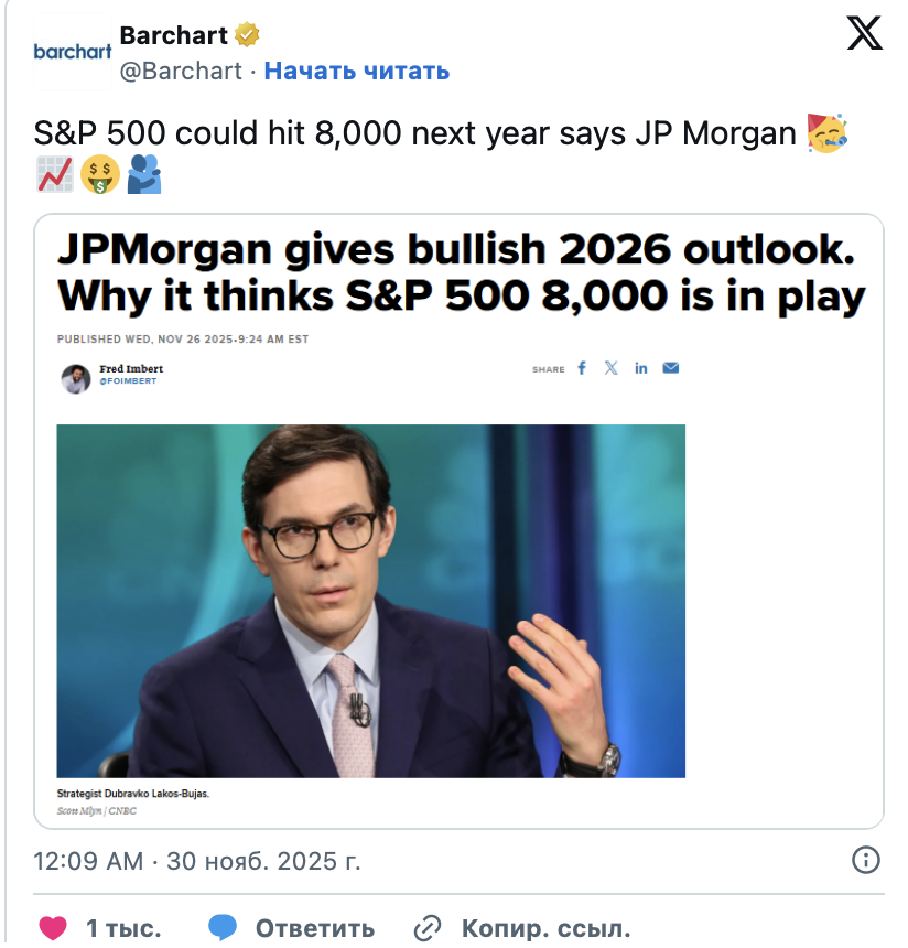 Банк JP Morgan ожидает, что индекс S&P 500 достигнет отметки 8,000 в следующем году. Этот взгляд подкрепляется мощными сезонными факторами. Прогноз согласуется с недавним мнением банка о «ралли всего».