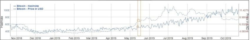 Судя по приведенному выше графику BitInfoChart, в период с мая по июнь 2019 года настроения в майнинговом сообществе шли в тесной связке с настроениями инвесторов. Рост цены неизменно сопровождался ростом хэшрейта. В последующие месяцы рост обоих показателей продолжался, что в итоге позволило хэшрейту достичь рекордного значения.