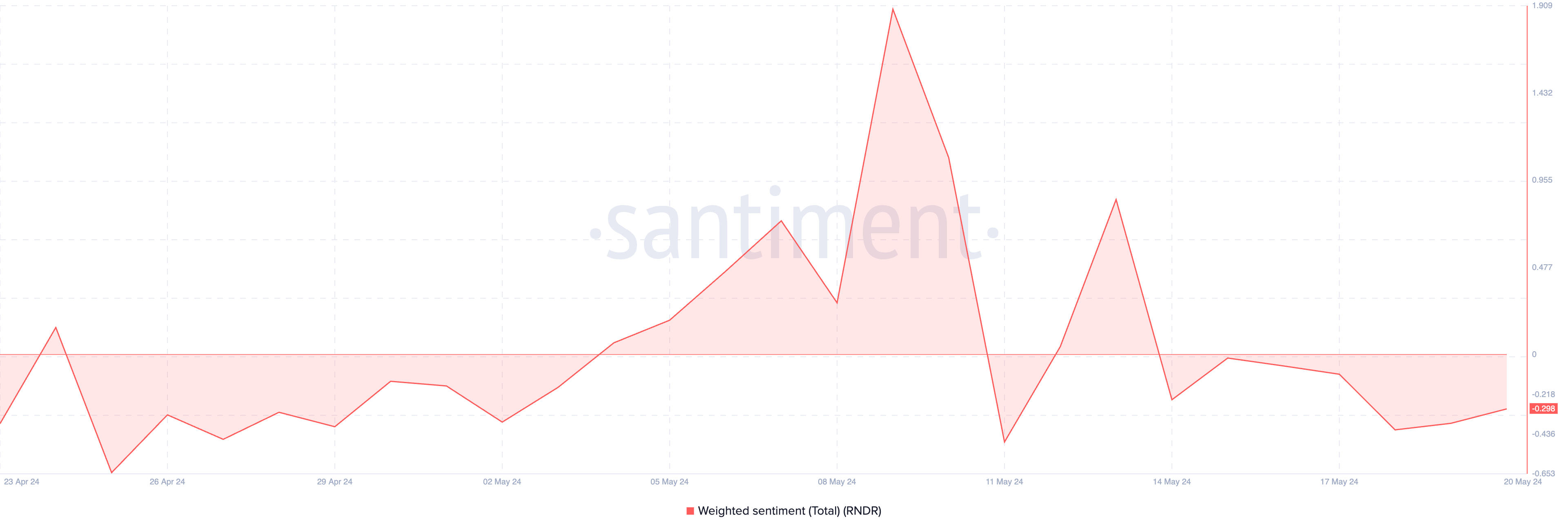 Ончейн-метрики подтверждают возможность начала коррекции. По данным аналитической платформы Santiment, взвешенные настроения по RNDR оказались в отрицательной зоне -0,29, что демонстрирует преобладающий негативный настрой участников рынка в отношении актива.