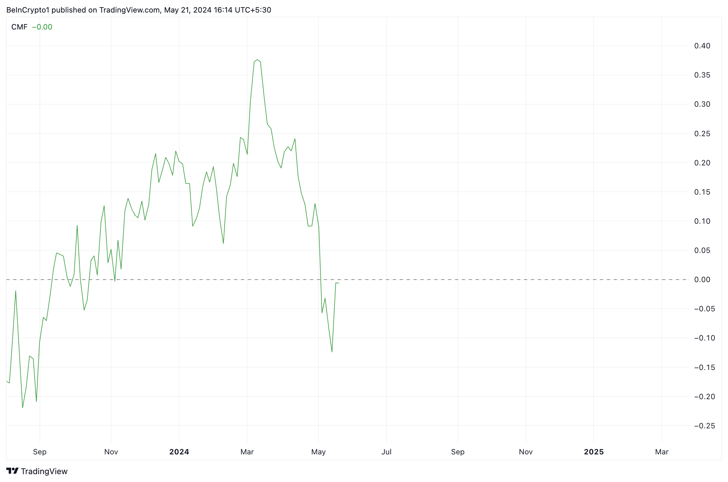 Текущее значение индикатора потока денег CMF RNDR составляет -0,01, что также намекает на развитие нисходящего тренда.
