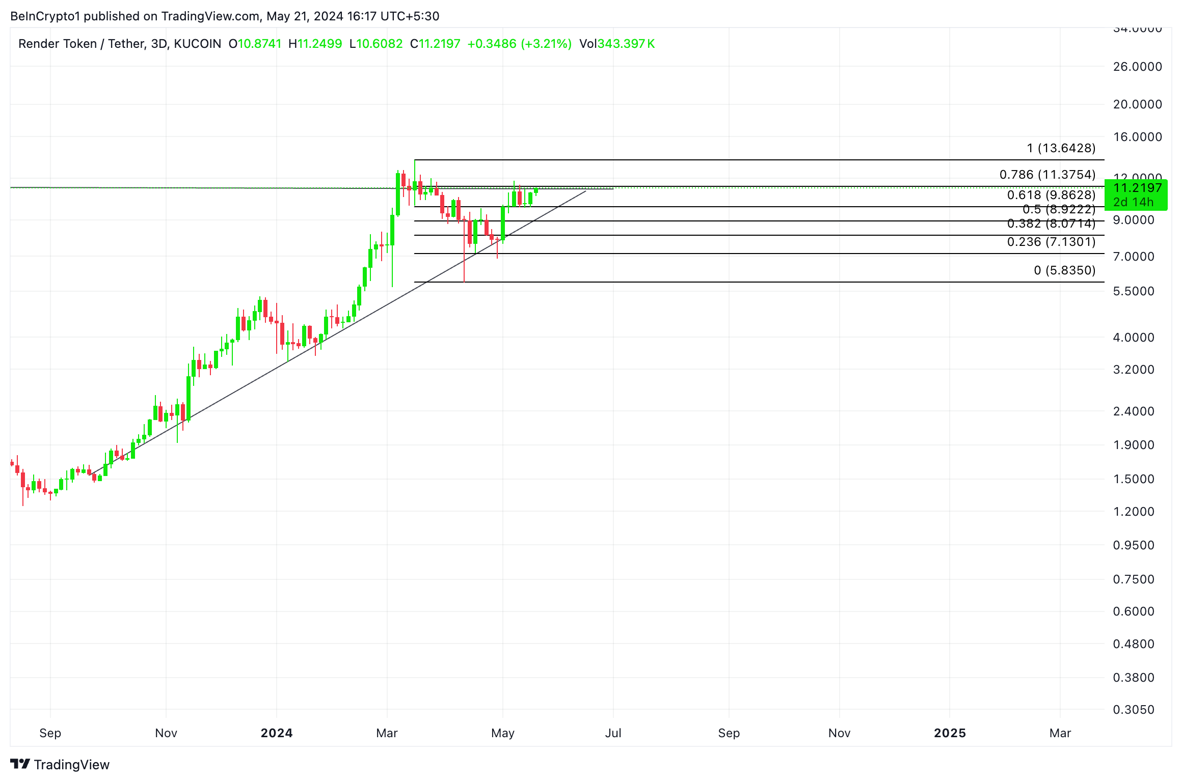 Если тенденция сохранится и Render не сможет прорваться выше верхней границы треугольника, он рискует упасть до $9,8.