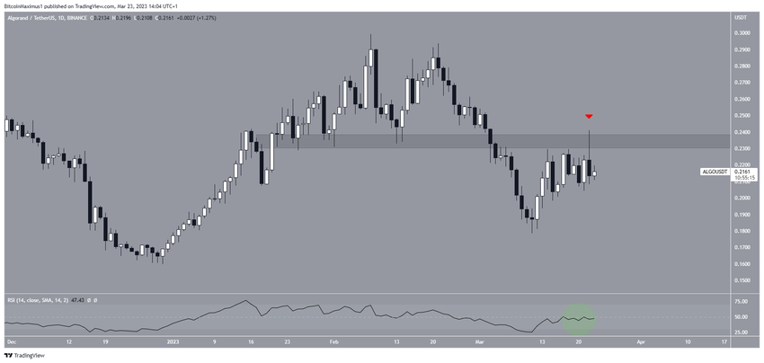 На дневном таймфрейме можно увидеть, что курс Algorand сформировал 21 февраля понижающийся максимум и с тех пор снижался. 11 марта цене удалось совершить отскок, но 22 марта на графике появился паттерн «падающая звезда» (красный значок) и в последующие сутки курс токена снижался. При этом рынок проверил на прочность область $0,235. Отскок цены совпал с отскоком индекса RSI от барьера 50.