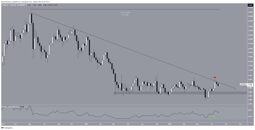 Как показывают результаты технического анализа недельного графика, LINK с мая 2021 года снижался вдоль нисходящей линии сопротивления. Это снижение в июне 2023 года привело рынок к минимуму $4,75. Сначала казалось, что это приведет к пробою горизонтальной области $6, которая присутствовала на графике с мая 2022 года.