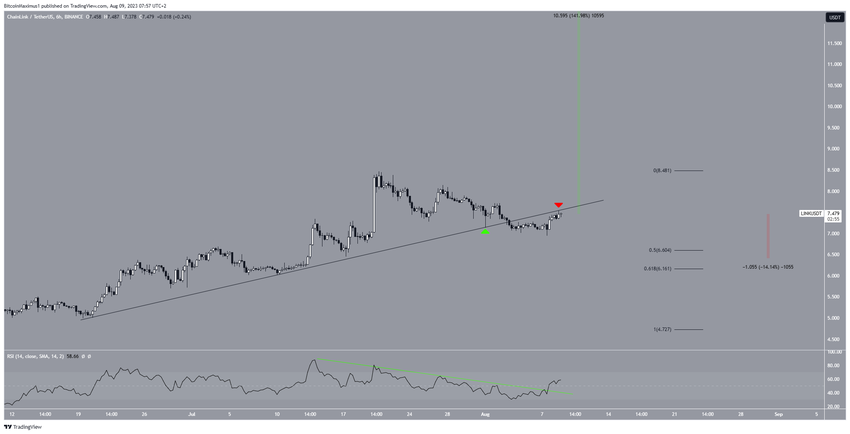 Sponsored SponsoredС момента формирования первого повышающегося минимума 20 июня, цена LINK росла вдоль очень крутой линии восходящей поддержки. 1 августа токен отскочил от этой линии поддержки, сформировав свечу «бычий молот» (зеленый значок).