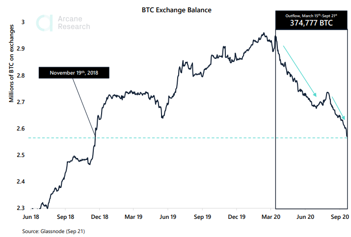 SponsoredПо состоянию на 21 сентября 2020 года, количество криптовалюты биткоин на крупных биржах составляет 2,5 млн BTC (~ $26,8 млрд при курсе на момент написания материала). Это на 374,7 тыс. BTC меньше, чем в рекордном марте 2020 года.