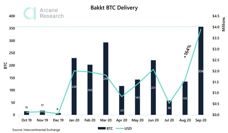 Впрочем, уменьшение резервов биткоина на биржах не сильно сказалось на поставках биткоин-фьючерсов на Bakkt. В сентябре объемы фьючерсов, удерживаемых до истечения срока, увеличились на 164% до 356 BTC, преодолев рекорд марта 2019 года.