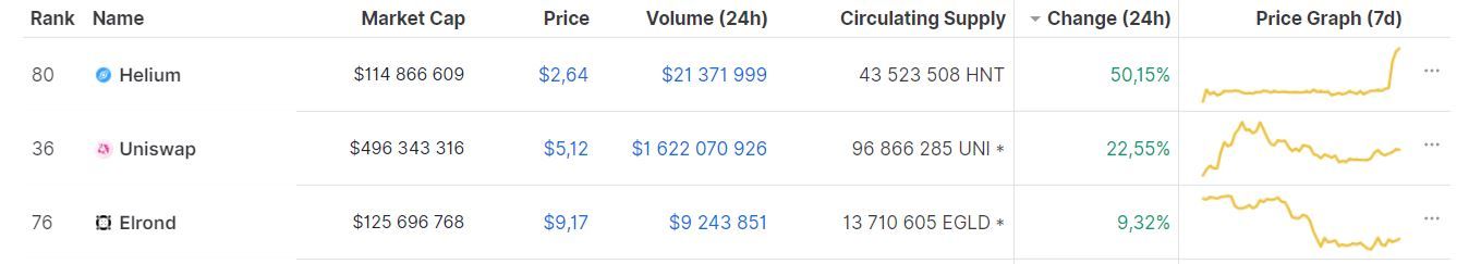 SponsoredВ течение недели UNI неоднократно становился лидером среди топ-100 самых капитализированных криптовалют по показателям прироста стоимости за сутки. По состоянию на 24 сентября 2020 года, токен обогнала только монета IoT-стартапа Helium. Проекту удалось опередить UNI на фоне запуска оборудования для майнинга своей криптовалюты.