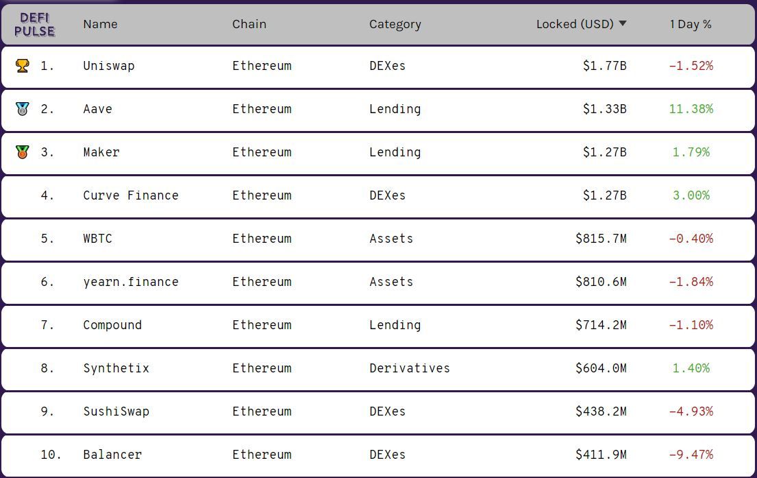 Uniswap, на фоне растущей популярности своего токена, вернулся на первое место рейтинга DeFi-проектов по совокупному объему заблокированных под их нужды средств. Ближайший конкурент платформы – SushiSwap – тем временем, опустился на 9 строчку.