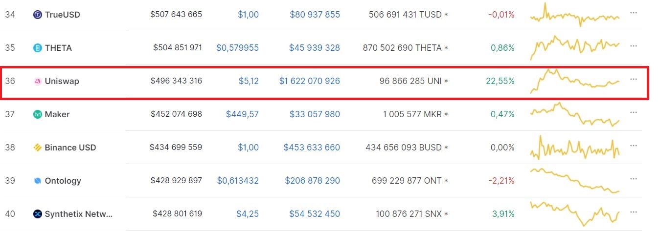 На момент написания материала, токен находится на 36 месте рейтинга капитализации и торгуется по $5,12. Максимум стоимости UNI зафиксирован 19 сентября на уровне $7,14 (по данным CoinMarketCap). Показатели другого агрегатора – CoinGecko – несколько отличаются. Максимум UNI, по данным платформы, зафиксирован 19 сентября на уровне $7,82, (что на 9% выше зарегистрированного на CoinMarketCap пика стоимости).