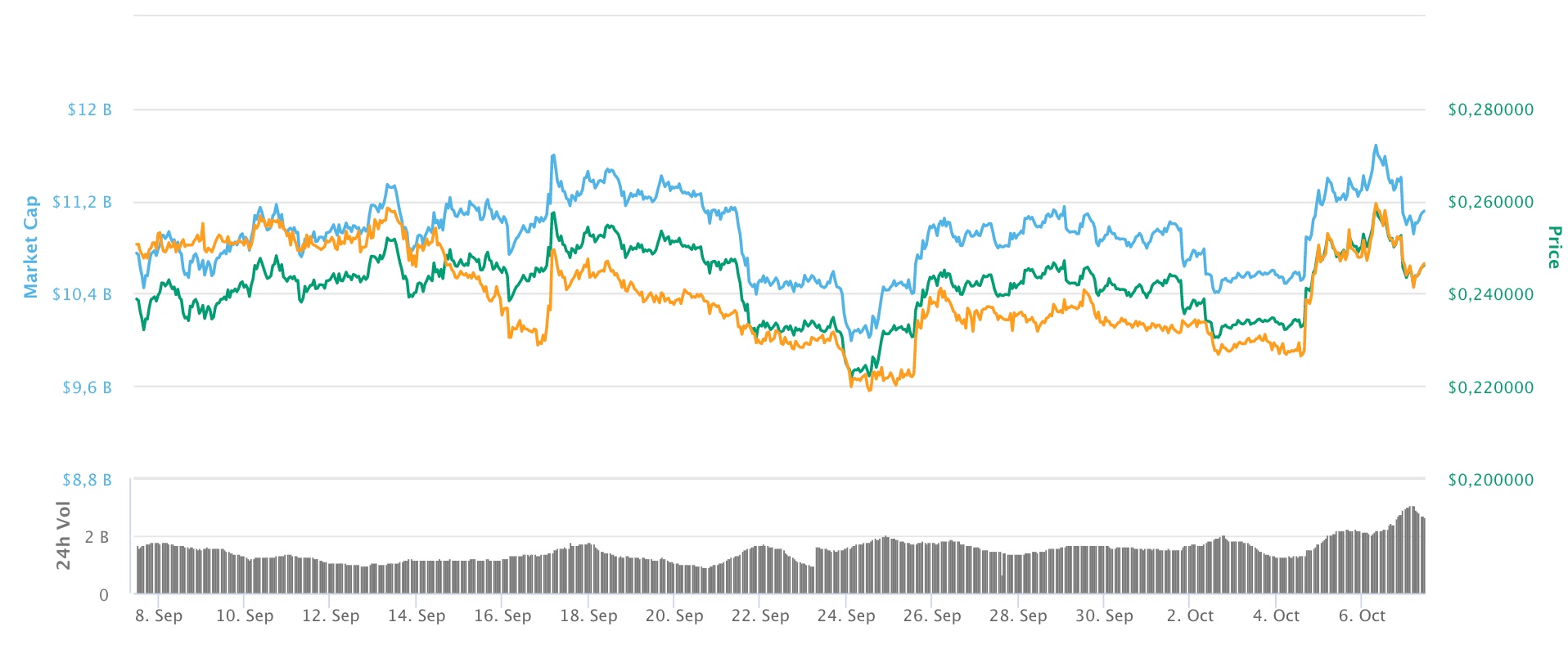 На момент написания материала XRP/USDT торгуется на уровне $0,24. За сутки монета подешевела более чем на 4%.