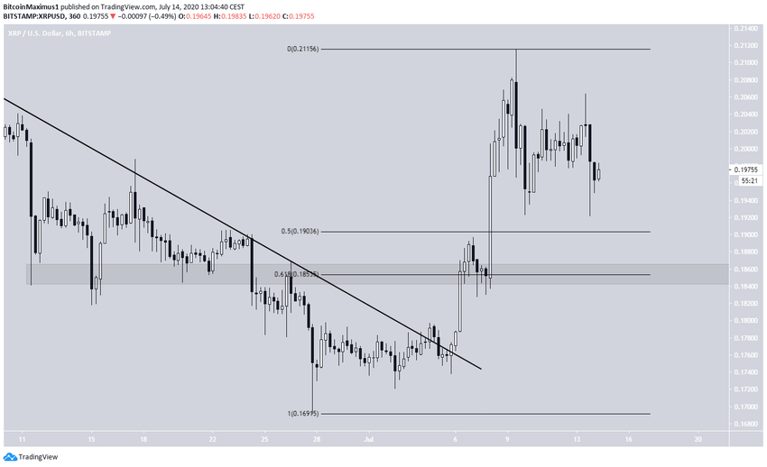 Анализ более краткосрочных таймфреймов демонстрирует, что рост цены забуксовал 10 июля, когда пара отметила максимум на $0.211 и начала снижаться от него.