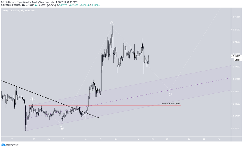 Для того чтобы этот волновой анализ подтвердился, важно будет проследить взаимодействие цены с текущим восходящим параллельным каналом, из которого недавно произошел бычий пробой. Снижение под $0.179 (линия поддержки канала и вершина подволны 1) нейтрализует текущий волновой анализ и может активизировать альтернативный сценарий, изложенный в твите.