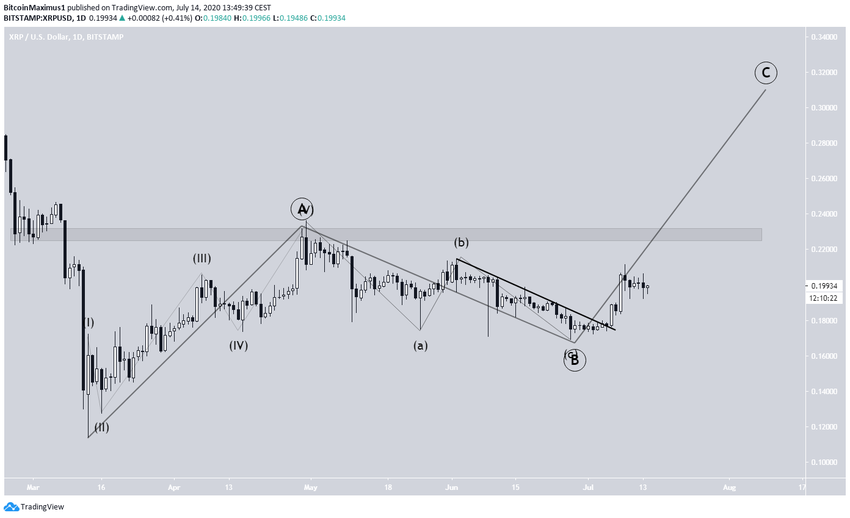 Текущая ситуация определенно напоминает завершение восходящей структуры A-B-C, однако альтернативный волновой анализ позволяет нам предположить, что цена завершила волну В и сейчас находится в фазе движения С. Такой сценарий будет подтвержден, если мы увидим рост выше отметки $0.225, представляющей собой вершину волны А.